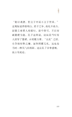 八 佾 第 三 “ 射 以 观 德, 但 主 于 中 而 不 主 于 贯 革。” 这规矩说得很明白,君子之争,尚礼不尚力。 射箭主要看人的德行,射中即可,不以穿 破箭靶为能。孔子这样说,应该是当时有 人射穿了箭靶,在炫耀力量。“主皮”之射, 有争强好胜之嫌,显得粗鄙无礼,这也是 当时一种风气的缩影。这让孔子非常感慨, 故方有此论。 133