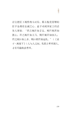 八 佾 第 三 君主把臣下视作狗马对待,那么饱受屈辱的 臣下也难有忠诚之心。孟子劝诫齐宣王的话 发人深省:“君之视臣如手足,则臣视君如 腹心;君之视臣如犬马,则臣视君如国人; 君之视臣如土芥,则臣视君如寇仇。”(《孟 子·离娄下》)人与人之间,先要去尊重别人, 才有可能收获尊重。 139