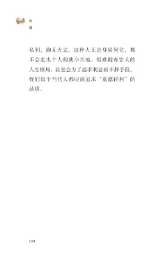 ?论 语 私利,胸无大志。这种人无论身居何位,都 不会走出个人的狭小天地,很难拥有宏大的 人生格局,甚至会为了追求利益而不择手段。 我们每个当代人都应该追求“重德轻利”的 品质。 180