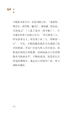 ?论 语 子贱曾为单父宰,在他当政之时,“躬敦厚, 明亲亲,尚笃敬,施至仁,加恳诚,致忠信, 百 姓 化 之 ”(《 孔 子 家 语· 屈 节 解 》)。 并 且他非常善于向别人学习,“所父事者三人, 所兄事者五人,所友者十有二人,所师者一 人”。可见,子贱的施政理念完全遵循了孔 子的教诲,并且广泛地与贤人君子结交,汲 取他们的优点和智慧,进而提高自己的道德 修养与执政水平。子贱的成功,就是在礼乐 环境的熏陶下,通过自己的博学广识、努力 进取实现的。 212
