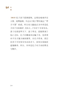 ?论 语 【解读】孔子善于借助器物,运用比喻来评论 人物、说明道理。不过由于孔子曾经说过“君 子不器”的话,所以有人据此认为本章是孔 子对子贡的批评。实际上,子贡才干非常突出, 善于经商富甲天下,善于外交,曾救鲁国于 危亡之际。孔子以瑚琏来比喻子贡,是着重 对子贡才能方面的褒奖。在孔子看来,高层 次君子不仅要有突出的才干,更要注重提高 道德修养。所以,本章是孔子对子贡的赞美 与期许。 214