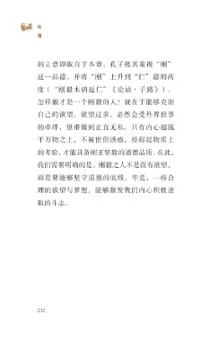 ?论 语 的立意即取自于本章。孔子极其重视“刚” 这一品德,并将“刚”上升到“仁”德的高 度(“ 刚 毅 木 讷 近 仁”《 论 语· 子 路》)。 怎样做才是一个刚毅的人?就在于能够克制 自己的欲望。欲望过多,必然会受外界世事 的牵绊,很难做到正直无私。只有内心超脱 于万物之上,不被世俗诱惑,经得起物质上 的考验,才能具备刚正坚毅的道德品质。在此, 我们需要明确的是,刚毅之人不是没有欲望, 而是要能够坚守道德的底线。毕竟,一些合 理的欲望与梦想,能够激发我们内心积极进 取的斗志。 232