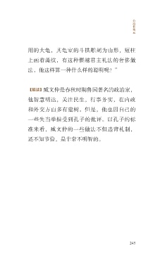 公 冶 长 第 五 用的大龟,其龟室的斗拱雕刻为山形,短柱 上画着藻纹,有这种僭越君主礼法的奢侈做 法,他这样算一种什么样的聪明呢?” 【解读】臧文仲是春秋时期鲁国著名的政治家, 他智慧明达,关注民生,行事务实,在内政 和外交方面多有建树。但是,他也因自己的 一些失当举措受到孔子的批评。以孔子的标 准来看,臧文仲的一些做法不但违背礼制, 还不知节俭,是非常不明智的。 245