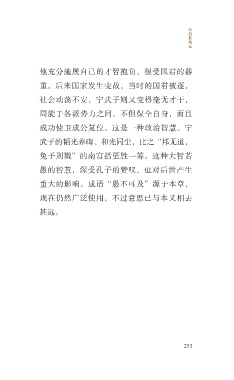 公 冶 长 第 五 他充分施展自己的才智抱负,很受国君的器 重。后来国家发生变故,当时的国君被逐, 社会动荡不安,宁武子则又变得毫无才干, 周旋于各派势力之间,不但保全自身,而且 成功使卫成公复位。这是一种政治智慧。宁 武子的韬光养晦、和光同尘,比之“邦无道, 免予刑戮”的南宫括更胜一筹。这种大智若 愚的智慧,深受孔子的赞叹,也对后世产生 重大的影响。成语“愚不可及”源于本章, 现在仍然广泛使用,不过意思已与本义相去 甚远。 253