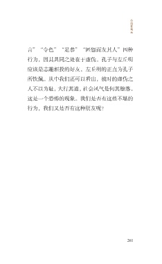公 冶 长 第 五 言”“令色”“足恭”“匿怨而友其人”四种 行为,因其共同之处在于虚伪。孔子与左丘明 应该是志趣相投的好友,左丘明的正直为孔子 所钦佩。从中我们还可以看出,彼时的虚伪之 人不以为耻,大行其道,社会风气是何其堕落。 这是一个恐怖的现象。我们是否有这些不堪的 行为,我们又是否有这种朋友呢? 261