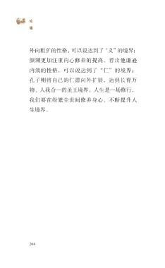?论 语 外向粗犷的性格,可以说达到了“义”的境界; 颜渊更加注重内心修养的提高,看出他谦逊 内敛的性格,可以说达到了“仁”的境界; 孔子则将自己的仁德向外扩展,达到长育万 物、人我合一的圣王境界。人生是一场修行, 我们要在纷繁尘世间修养身心,不断提升人 生境界。 264
