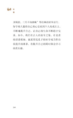 ?论 语 齐闻韶,三月不知肉味”等经典的好学言行。 好学的人能将自己的心思放到个人的成长上, 不断地提升自己,让自己的生命不断趋于完 美。如今,我们有古人的前车之鉴,有老者 的谆谆教诲,就更要把孔子的好学观当作自 我提升的要求,在提升自己的同时体会学习 的真乐趣。 268