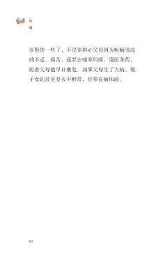 ?论 语 要勤快一些了,不仅要担心父母因为疾病引起 的不适、痛苦,还要去嘘寒问暖,请医拿药, 盼着父母能早日康复。如果父母生了大病,做 子女的甚至要衣不解带,侍奉在病床前。 60
