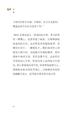 ?论 语 子弟们代替父兄做,有酒食,让父兄先食用, 难道这就可以认为是孝了吗?” 【解读】本章承接上一章讲的是尽孝。孝不但要 有一颗敬心,还要外化于面容,长期和颜悦 色地对待父母,这可算是孝的最高境界。在 现实生活中,一般情况下,我们面对外人即 便是心情不好,也能露出礼貌的微笑。而回 到家中面对父母,常常急躁不安,这虽然并 不是你内心不孝,但你的孝心也因此大打折 扣。孝心常体现在细节处,常怀黄香温席之心, 感慨彩衣娱亲的良苦用心,以和颜悦色的态 度温暖父母心,定可使父母享受天伦之乐。 64