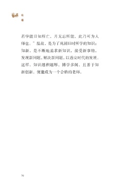 ?论 语 若学能日知所亡,月无忘所能,此乃可为人 师也。”温故,是为了巩固旧时所学的知识; 知新,是不断地追求新知识,接受新事物, 发现新问题,解决新问题,以适应时代的发展。 这样,知识越积越厚,博学多闻,且善于知 新创新,便能成为一个合格的老师。 70