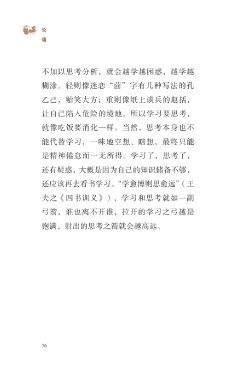?论 语 不加以思考分析,就会越学越困惑,越学越 糊涂。轻则像迷恋“茴”字有几种写法的孔 乙己,贻笑大方;重则像纸上谈兵的赵括, 让自己陷入危险的境地。所以学习要思考, 就像吃饭要消化一样。当然,思考本身也不 能代替学习,一味地空想、瞎想,最终只能 是精神倦怠而一无所得。学习了,思考了, 还有疑惑,大概是因为自己的知识储备不够, 还应该再去看书学习。“学愈博则思愈远”(王 夫之《四书训义》),学习和思考就如一副 弓箭,谁也离不开谁,拉开的学习之弓越是 饱满,射出的思考之箭就会越高远。 76