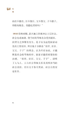 ?论 语 的君不像君,臣不像臣,父不像父,子不像子, 即使有粮食,我能吃得到吗?” 【解读】春秋时期,新兴地主阶级冲击上层社会, 社会变动加剧,使当时的等级名分受到破坏, 弑君父之事屡有发生,孔子认为这是国家动 乱的主要原因。所以他十分推崇“君君、臣臣、 父父、子子”的理念,认为只有如此,才能 恢复社会的等级秩序,国家才能得到很好的 治 理。“ 君 君, 臣 臣, 父 父, 子 子 ”, 讲 明 了人与人、人与社会等级关系及其所担当的 社会责任。君臣父子各尽其责,社会自然安 定有序。 96