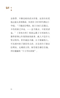 ?论 语 是鲁莽、不修边幅的武夫形象,这是历史把 他过滤太多的缘故。朱熹在《四书章句集注》 中说:“子路忠信明决,故言出而人信服之, 不待其辞之毕也。……急于践言,不留其诺 也。”《春秋左传》里就记载了小邾国有人 想带着领土归属鲁国的故事,此人不信什么 誓言盟约,单单就信子路,让子路做保人, 可见彼时的子路信誉之高。正是因为子路忠 信明决,兑现诺言快,原告被告都信任他, 所以能做到“片言可以折狱”。 98