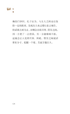 ?论 语 确是门学问。孔子认为,与友人之间也应保 持一定的距离,发现友人有过错以忠言相告, 但话要点到为止,否则会自取其辱。朋友之间, 因一方犯了一点错误,另一方就喋喋不休, 这就会让人觉得厌烦。因此,朋友之间说话 要有分寸,把握一个度,友谊方能长久。 124