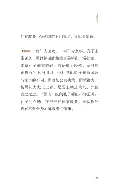 子 路 第 十 三 如有政务,虽然国君不用我了,我也会知道。” 【解读】“政”为国政,“事”为家事。孔子主 张正名,所以把国政和家事分辨得十分清楚。 本章孔子举重若轻,言语颇为轻松,及时纠 正冉有的不当用词,也让其他弟子知道国政 与家事的不同。国政是公共决策,群策群力。 按周礼大夫以上者,是要上朝进言的,并且 言之无过。“国老”级的孔子哪能不知道呢? 孔子的立场,在于维护国家政务,也是教导 冉有不要全身心地效忠于家事。 155