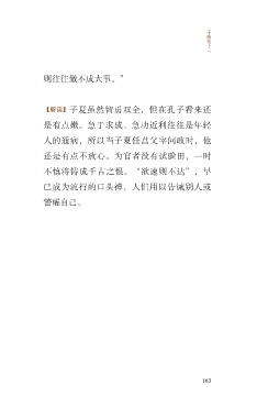 子 路 第 十 三 则往往做不成大事。” 【解读】子夏虽然智勇双全,但在孔子看来还 是有点嫩。急于求成、急功近利往往是年轻 人的通病,所以当子夏任莒父宰问政时,他 还是有点不放心。为官者没有试验田,一时 不慎将铸成千古之恨。“欲速则不达”,早 已成为流行的口头禅,人们用以告诫别人或 警醒自己。 163