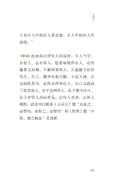 子 路 第 十 三 不如乡人中的好人喜欢他,乡人中的坏人厌 恶他。” 【解读】此章谈论评价人的标准。乡人当中, 有好人,也有坏人。想要取悦所有人,必然 做事无原则,不敢得罪坏人,只能做个好好 先生。反之,做事死板冷酷,不近人情,甚 至胡乱作为,必然会得罪好人,自己也就成 了孤家寡人。对于这两种人,孔子都不认可。 孔子评价人的标准是,让好人喜欢,让坏人 痛恨。此章可以联系《卫灵公》篇“众恶之, 必察焉;众好之,必察焉”和《阳货》篇“乡 原,德之贼也”来理解。 181