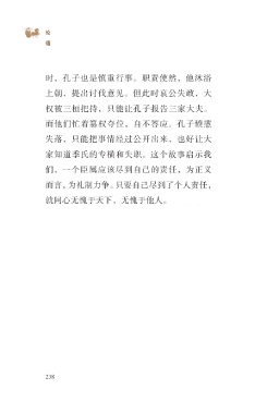 ?论 语 时,孔子也是慎重行事。职责使然,他沐浴 上朝,提出讨伐意见。但此时哀公失政,大 权被三桓把持,只能让孔子报告三家大夫。 而他们忙着篡权夺位,自不答应。孔子愤懑 失落,只能把事情经过公开出来,也好让大 家知道季氏的专横和失职。这个故事启示我 们,一个臣属应该尽到自己的责任,为正义 而言,为礼制力争。只要自己尽到了个人责任, 就问心无愧于天下,无愧于他人。 238