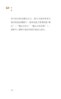 ?论 语 学习的目的是修治自己,而今天的学者学习 的目的是治理别人”,是因为孔子看重的是“修 己”(“修己以安人”“修己以安百姓”), 而看不上那些不知治身而只知治人的人。 242