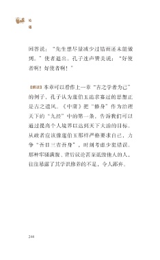 ?论 语 回答说:“先生想尽量减少过错而还未能做 到。”使者退出。孔子连声赞美说:“好使 者啊!好使者啊!” 【解读】本章可以看作上一章“古之学者为己” 的例子,孔子认为蘧伯玉追求寡过的思想正 是古之遗风。《中庸》把“修身”作为治理 天下的“九经”中的第一条,告诉我们可以 通过提高个人境界以达到天下大治的目标。 从政者应该像蘧伯玉那样严格要求自己,力 争“吾日三省吾身”,时刻考虑少犯错误。 那种牢骚满腹、背后议论甚至诋毁他人的人, 往往暴露了其学识修养的不足,令人鄙弃。 244