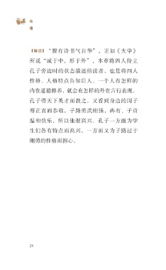 ?论 语 【 解 读】“ 腹 有 诗 书 气 自 华”, 正 如《 大 学》 所说“诚于中,形于外”,本章将四人侍立 孔子旁边时的状态描述给读者,也是将四人 性格、人格特点告知后人。一个人有怎样的 内在道德修养,就会有怎样的外在言行表现。 孔子得天下英才而教之,又看到身边的闵子 骞正直而恭敬,子路勇武刚强,冉有、子贡 温和快乐,所以他很高兴。孔子一方面为学 生们各有特点而高兴,一方面又为子路过于 刚勇的性格而担心。 28