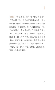颜 渊 第 十 二 【解读】“君子不忧不惧”与“君子坦荡荡” 是异曲同工的。司马牛不但话多性急,还似 乎领悟力较差,傻呵呵地觉得不忧不惧就能 成为君子,好像简单了些。孔子随即跟了一句: “内省不疚,夫何忧何惧?”想必震惊了司 马牛,也震惊了后来者。是啊!一个人没有 做过对不起任何人的事,自己内心哪有什么 愧疚,有何忧惧?内省不疚,其实是一个崇 高的精神境界。俗话说:“为人不做亏心事, 半夜敲门心不惊。”行走天地间,心胸坦荡荡, 这是一种生命的坦然。 77