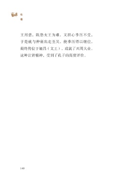 ?论 语 王用意,既恐太王为难,又担心季历不受, 于是就与仲雍出走至吴,使季历得以继位, 最终传位于姬昌(文王),成就了兴周大业。 这种让贤精神,受到了孔子的高度评价。 140