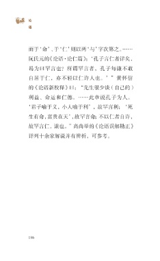 ? 论 语 而于‘命’、于‘仁’则以两‘与’字次第之。…… 阮氏元的《论语·论仁篇》:‘孔子言仁者详矣, 曷为曰罕言也?所谓罕言者,孔子每谦不敢 自居于仁,亦不轻以仁许人也。’”黄怀信 的《论语新校释》曰:“先生很少谈(自己的) 利益、命运和仁德。……此章说孔子为人。 ‘君子喻于义,小人喻于利’,故罕言利;‘死 生有命,富贵在天’,故罕言命;不以仁者自许, 故罕言仁,谦也。”高尚举的《论语误解勘正》 详列十余家解说并有辨析,可参考。 186