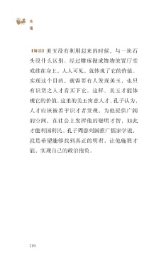 ?论 语 【解读】美玉没有利用起来的时候,与一块石 头没什么区别。经过雕琢做成饰物放置厅堂 或挂在身上,人人可见,就体现了它的价值。 实现这个目的,就需要有人发现美玉,也只 有识货之人才肯买下它。这样,美玉才能体 现它的价值。这里的美玉寓意人才,孔子认为, 人才应该被善于识才者发现,为他提供广阔 的空间,在社会上发挥他的聪明才智,如此 才能利国利民。孔子周游列国推广儒家学说, 就是希望能够找到真正的明君,让他施展才 能,实现自己的政治抱负。 210