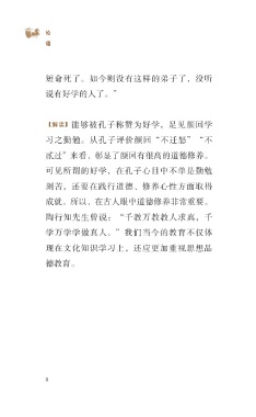 ?论 语 短命死了。如今则没有这样的弟子了,没听 说有好学的人了。” 【解读】能够被孔子称赞为好学,足见颜回学 习之勤勉。从孔子评价颜回“不迁怒”“不 贰过”来看,彰显了颜回有很高的道德修养。 可见所谓的好学,在孔子心目中不单是勤勉 刻苦,还要在践行道德、修养心性方面取得 成就。所以,在古人眼中道德修养非常重要。 陶行知先生曾说:“千教万教教人求真,千 学万学学做真人。”我们当今的教育不仅体 现在文化知识学习上,还应更加重视思想品 德教育。 8
