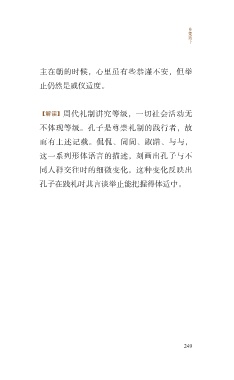 乡 党 第 十 主在朝的时候,心里虽有些恭谨不安,但举 止仍然是威仪适度。 【解读】周代礼制讲究等级,一切社会活动无 不体现等级。孔子是尊崇礼制的践行者,故 而有上述记载。侃侃、訚訚、踧踖、与与, 这一系列形体语言的描述,刻画出孔子与不 同人群交往时的细微变化。这种变化反映出 孔子在践礼时其言谈举止能把握得体适中。 249