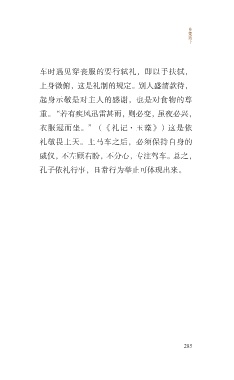 乡 党 第 十 车时遇见穿丧服的要行轼礼,即以手扶轼, 上身微俯,这是礼制的规定。别人盛情款待, 起身示敬是对主人的感谢,也是对食物的尊 重。“若有疾风迅雷甚雨,则必变,虽夜必兴, 衣 服 冠 而 坐。”(《 礼 记· 玉 藻 》) 这 是 依 礼敬畏上天。上马车之后,必须保持自身的 威仪,不左顾右盼,不分心,专注驾车。总之, 孔子依礼行事,日常行为举止可体现出来。 285