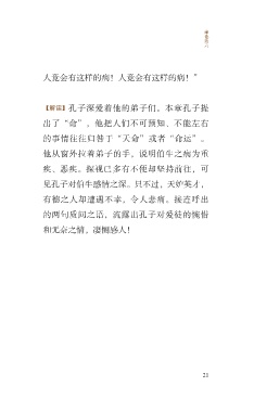 雍 也 第 六 人竟会有这样的病!人竟会有这样的病!” 【解读】孔子深爱着他的弟子们。本章孔子提 出了“命”,他把人们不可预知、不能左右 的事情往往归咎于“天命”或者“命运”。 他从窗外拉着弟子的手,说明伯牛之病为重 疾、恶疾。探视已多有不便却坚持前往,可 见孔子对伯牛感情之深。只不过,天妒英才, 有德之人却遭遇不幸,令人悲痛。接连呼出 的两句质问之语,流露出孔子对爱徒的惋惜 和无奈之情,凄恻感人! 21