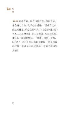 ?论 语 【解读】陋巷之陋,陋在口腹之享;颜回之乐, 乐在身心自由。孔子也曾说过:“饭疏食饮水, 曲肱而枕之,乐亦在其中矣。”(《论语·述而》) 可见二人虽为师徒,但心心相通,实为契友矣。 难怪孔子深情地咏叹:“贤哉,回也!贤哉, 回也!”这不仅是对颜回的赞颂,更是自我 的抒怀!非孔子不得成其徒,非颜子不得尽 其情! 24