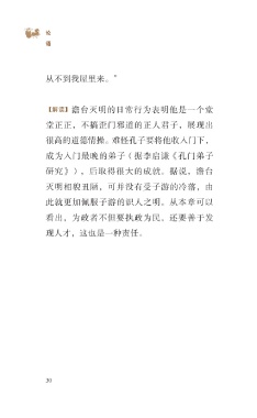 ?论 语 从不到我屋里来。” 【解读】澹台灭明的日常行为表明他是一个堂 堂正正,不搞歪门邪道的正人君子,展现出 很高的道德情操。难怪孔子要将他收入门下, 成为入门最晚的弟子(据李启谦《孔门弟子 研究》),后取得很大的成就。据说,澹台 灭明相貌丑陋,可并没有受子游的冷落,由 此就更加佩服子游的识人之明。从本章可以 看出,为政者不但要执政为民,还要善于发 现人才,这也是一种责任。 30