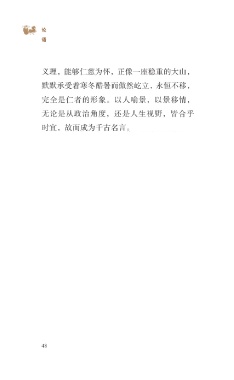 ?论 语 义理,能够仁慈为怀,正像一座稳重的大山, 默默承受着寒冬酷暑而傲然屹立,永恒不移, 完全是仁者的形象。以人喻景,以景移情, 无论是从政治角度,还是人生视野,皆合乎 时宜,故而成为千古名言。 48