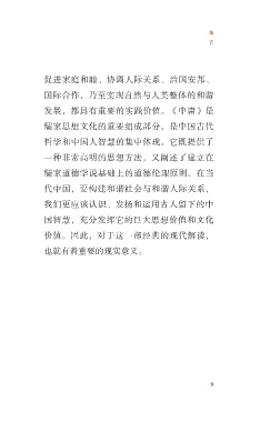 ? 前 言 促进家庭和睦、协调人际关系、治国安邦、 国际合作,乃至实现自然与人类整体的和谐 发展,都具有重要的实践价值。《中庸》是 儒家思想文化的重要组成部分,是中国古代 哲学和中国人智慧的集中体现。它既提供了 一种非常高明的思想方法,又阐述了建立在 儒家道德学说基础上的道德伦理原则。在当 代中国,要构建和谐社会与和谐人际关系, 我们更应该认识、发扬和运用古人留下的中 国智慧,充分发挥它的巨大思想价值和文化 价值。因此,对于这一部经典的现代解读, 也就有着重要的现实意义。 9