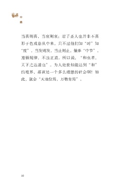 ? 中 庸 当喜则喜,当哀则哀;君子圣人也并非不喜 形于色或悲从中来,只不过他们知“时”知 “度”,当发则发,当止则止,做事“中节”, 遵循规律,不违正道。所以说,“和也者, 天下之达道也”。为人处世如能达到“和” 的境界,那该是一个多么理想的社会啊!如 此,就会“天地位焉,万物育焉”。 10