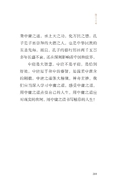 第 三 十 三 章 秉中庸之道,承上天之功,化万民之德。孔 子是子思崇拜的大德之人,也是中华民族的 至圣先师。而且,孔子的德行历经两千五百 多年长盛不衰,还在深刻影响着中国和世界。 中庸是大智慧。中庸不是平庸,是恰到 好处,中庸是平和中的睿智,是温柔中蕴含 的刚毅。中庸之道体大精微,神奇玄妙,我 们应当深入学习中庸之道,感受中庸之道, 用中庸之道点亮自己的人生,用中庸之道应 对现实的坎坷,用中庸之道书写精彩的人生! 289
