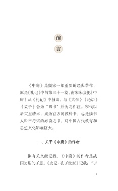 前 言 《中庸》是儒家一部重要的经典著作, 原是《礼记》中的第三十一篇。南宋朱熹把《中 庸》从《礼记》中抽出,与《大学》《论语》 《孟子》合为“四书”并为之作注。宋代以 后直至清末,成为官方的教科书,也是读书 人科举考试的必读之书,对中国古代教育和 思想文化影响巨大。 一、关于《中庸》的作者 据有关文献记载,《中庸》的作者是战 国初期的子思。《史记·孔子世家》记载:“子 1