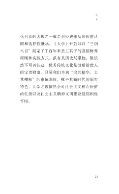 经 一 章 化自觉的表现之一就是对经典作品的价值认 同和选择性继承。《大学》开篇即以“三纲 八目”制定了千百年来圣王君子的道德修养 原则和实践方式,虽有其历史局限性,但依 然不可否认这一优秀传统文化是馈赠给世人 的宝贵财富。只要我们本着“取其精华,去 其糟粕”的审慎态度,赋予其新时代的固有 特色,大学之道依然会对社会主义核心价值 的弘扬以及社会主义精神文明建设起到积极 作用。 23