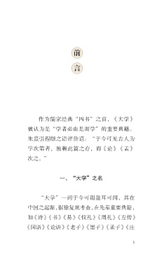 前 言 作为儒家经典“四书”之首,《大学》 被认为是“学者必由是而学”的重要典籍。 朱熹引程颐之语评价道:“于今可见古人为 学次第者,独赖此篇之存,而《论》《孟》 次之。” 一、“大学”之名 “大学”一词于今可谓盈耳可闻,其在 中国之起源,据徐复观考查,在先秦重要典籍, 如《诗》《书》《易》《仪礼》《周礼》《左传》 《国语》《论语》《老子》《墨子》《孟子》《庄 1