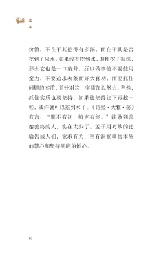 ?孟 子 价值,不在于其挖得有多深,而在于其是否 挖到了泉水,如果没有挖到水,即便挖了很深, 那么它也是一口废井。所以做事情不要使用 蛮力,不要追求表象而好大喜功,而要抓住 问题的实质,并针对这一实质加以努力。当然, 抓住实质也要坚持,如果能坚持往下再挖一 些,或许就可以挖到水了。《诗经·大雅·荡》 有言:“靡不有初,鲜克有终。”能做到善 始善终的人,实在太少了。孟子用巧妙的比 喻告诫人们,欲求有为,当有洞察事物本质 的慧心和坚持到底的恒心。 80