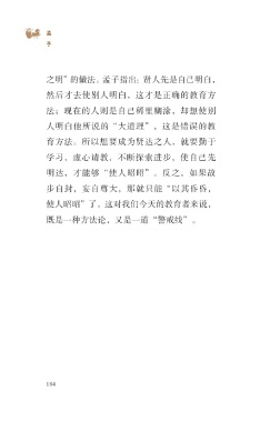 ?孟 子 之明”的做法。孟子指出:贤人先是自己明白, 然后才去使别人明白,这才是正确的教育方 法;现在的人则是自己稀里糊涂,却想使别 人明白他所说的“大道理”,这是错误的教 育方法。所以想要成为贤达之人,就要勤于 学习,虚心请教,不断探索进步,使自己先 明达,才能够“使人昭昭”。反之,如果故 步自封,妄自尊大,那就只能“以其昏昏, 使人昭昭”了。这对我们今天的教育者来说, 既是一种方法论,又是一道“警戒线”。 184
