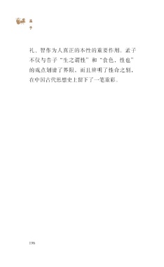 ?孟 子 礼、智作为人真正的本性的重要作用。孟子 不仅与告子“生之谓性”和“食色,性也” 的观点划清了界限,而且辨明了性命之别, 在中国古代思想史上留下了一笔重彩。 196