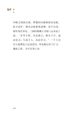 ?孟 子 早晚会招致灾祸。曹魏时的杨修便是如此, 恃才放旷,屡次动触曹操逆鳞,却不自知, 最终身首异处。三国时期魏人李康《运命论》 说:“木秀于林,风必摧之;堆出于岸,流 必湍之;行高于人,众必非之。”一个人仅 有小聪明是不足处世的,唯有践行君子仁义、 谦逊之道,方可安身立命。 208