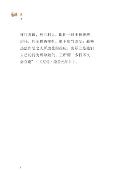 ?孟 子 推行善道,利己利人,即便一时不被理解、 信任,甚至遭遇挫折,也不应当改变;那些 违法作恶之人所遭受的报应,实际上是他们 自己的行为所导致的,正所谓“多行不义, 必自毙”(《左传·隐公元年》)。 8
