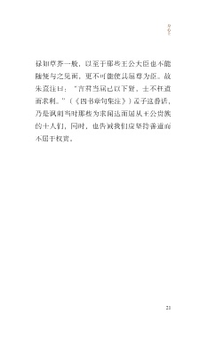 尽 心 上 禄如草芥一般,以至于那些王公大臣也不能 随便与之见面,更不可能使其屈尊为臣。故 朱熹注曰:“言君当屈己以下贤,士不枉道 而求利。”(《四书章句集注》)孟子这番话, 乃是讽刺当时那些为求闻达而屈从王公贵族 的士人们,同时,也告诫我们应坚持善道而 不屈于权贵。 21