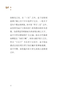 ?孟 子 的教化之乐。在“三乐”之外,孟子还特别 强调了称王天下并不是君子之乐。一统天下 是每个霸主的梦想,却不在“君子三乐”之中, 这是因为孟子主张的是仁政和德治的民本思 想。为获得富贵利禄而大肆杀伐以称王天下, 这并不符合儒家的仁义之道;而且古代儒者 的理想是“为帝王师”,而非自践于帝王之位, 所以“王天下”不在君子之乐中。孟子的这 番话让我们明白君子的乐趣并非神秘莫测、 高不可攀,而是蕴含在日常生活的人伦情理 之中。 52