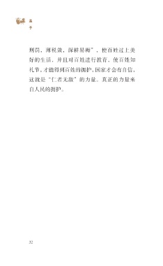 ?孟 子 刑罚,薄税敛,深耕易耨”,使百姓过上美 好的生活,并且对百姓进行教育,使百姓知 礼节,才能得到百姓的拥护,国家才会有自信, 这就是“仁者无敌”的力量。真正的力量来 自人民的拥护。 32